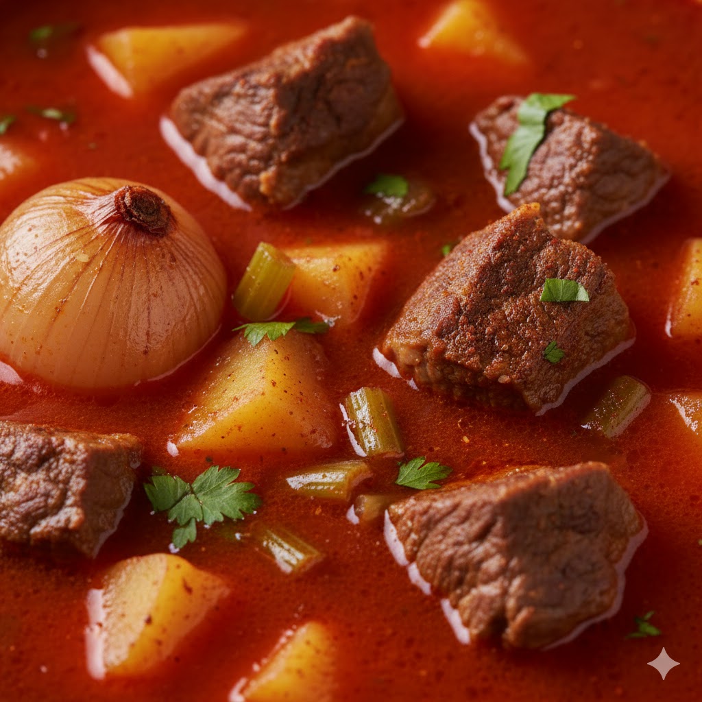 לגרד בצל אחד בפומפיה ולטגן בסיר עמוק, כשמזהיב להוסיף כף שטוחה פפריקה מתוקה, 2 כפות חוויאג' למרק ולערבב היטב. להוסיף את הבשר ולצרוב מכל הכיוונים ולהוסיף חצי כפית כורכום, כפית כמון, כפית פלפל שחור, 2 כפות א. מרק עוף, כף מלח ולמלא את הסיר במים רותחים, להוסיף בצל שלם, סלרי, צרור פטרוזיליה ולבשל על אש גבוהה. כשמבעבע להוציא את צרור הפטרוזיליה, להנמיך את האש ולאחר שעה להוסיף תפו"א ולבשל עד שהתפו"א מתרכך.