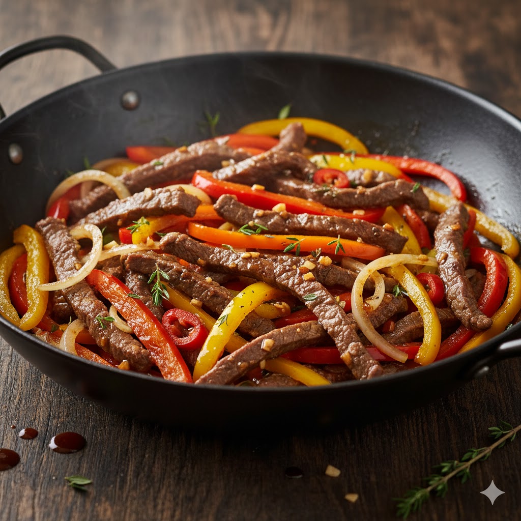 לטגן עד שהרצועות מחליפות צבע. להוסיף את הפלפלים ולערבב. להוסיף מעט מהמרינדה שנשארה בקערה ולהקפיץ ביחד כ-5 דקות.